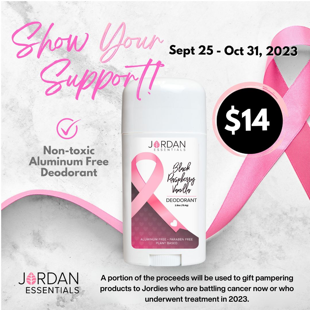 During the month of October, Jordan Essentials is committed to doing our part. A portion of the proceeds from every purchase of our Black Raspberry Vanilla Deodorant will be used to gift pampering products to women in our Jordan Community who are battling all types of cancer now or who underwent treatment in 2023.